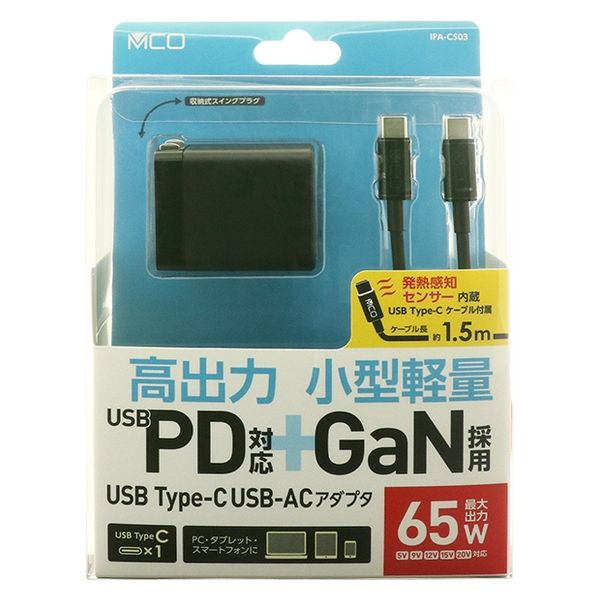 | 商品の特徴 | USB PD対応USBーACアダプタ/ケーブルセット。大容量の65W出力対応。自動で最適充電。GaN採用で小型軽量化。ケーブルに発熱感知センサー内蔵。各種安全保護機能搭載。持ち運び、収納にも便利なスイング式のACプラグ。 | ||