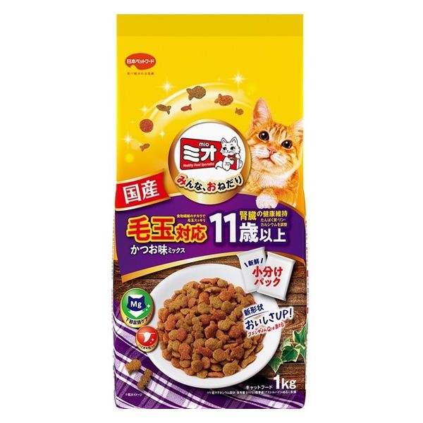 | 商品の特徴 | みんな、おねだり「ミオ」。日本で暮らす愛猫の健康を考えた、優れた栄養バランス。かつおとまぐろと小魚の旨みたっぷりうす型小粒をミックス。みんながおねだりしたくなる、とまらないおいしさ!食物繊維のチカラで、毛玉すっきり。胃に溜まった毛玉の排泄を助ける毛玉対応。11歳以上の愛猫の腎臓の健康維持を考え、たんぱく質、リン、カルシウムを調整。噛んで歯垢を除去し、歯の健康と口臭のケア。新鮮小分けパック。#総合栄養食 ペット ネコ 猫 猫ちゃん 愛猫 ドライフード キャットフード シニア猫 高齢猫 | ||
