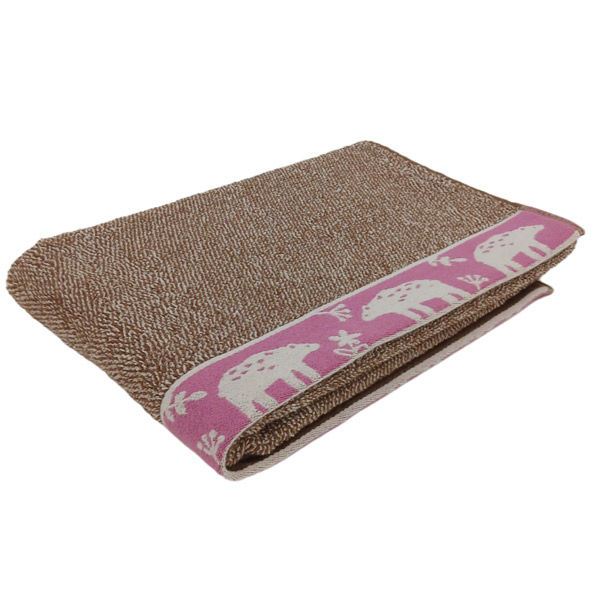 動物の柄を施したヘムがワンポイントの、可愛らしいタオル。2色の糸を使用することで、おしゃれなカラーになっています。使い勝手の良い、ちょうどいい厚さのタオルです。