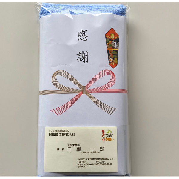 日繊商工 感謝の熨斗付き「少し長め日本製タオル/水色」【名刺ポケット付袋入】 PC401LB-kansha-240 1箱(240枚入)(直送品)
