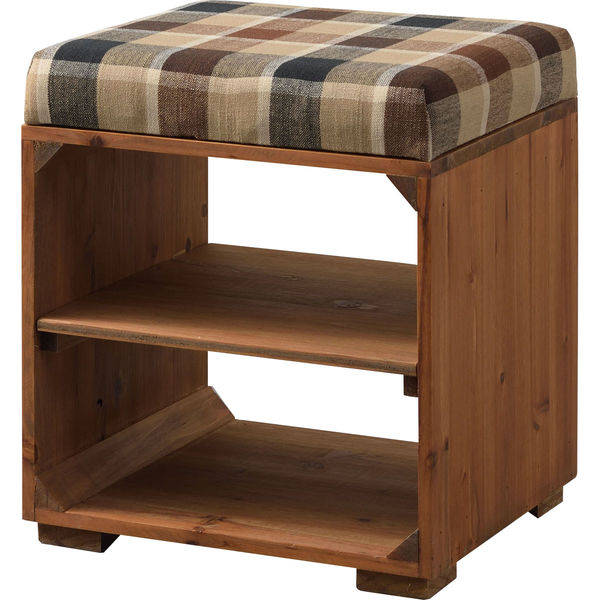 | 商品の特徴 | 座面の高さが39cmとやや低めに設計してあるので、玄関先の腰掛用など靴を履くのに調度良い高さでおススメ。棚板が付いているので上下に荷物を収納することが可能。また、棚板は簡単に外せるので高さのある靴を収納する事もできます。座面にはクッション性のある厚めのウレタンを使用。 | ||