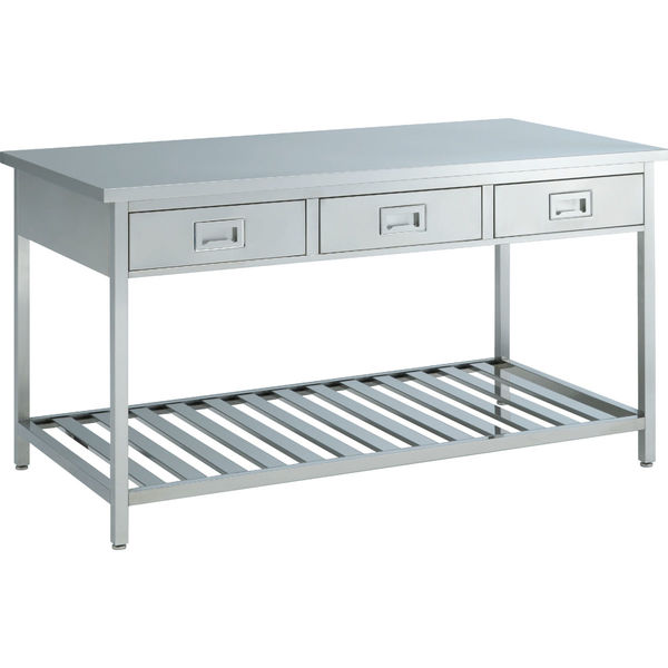 天板/ステンレス(SUS304)、本体/ステンレス(SUS304)、アジャスター付、最大積載質量/150kg(等分布質量)