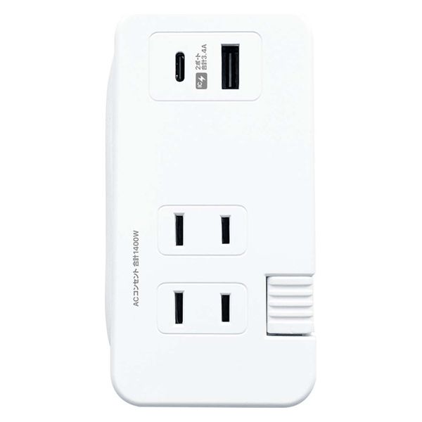 | 商品の特徴 | コンパクトにまとまり旅行に最適な電源タップ。3口のACコンセントとUSB Type-C×1、USB-A×1ポート搭載です。コネクタの裏表を気にせず挿せるリバーシブルUSBポート、自動識別IC搭載で端末に合わせて最適な充電が可能です。100-240V対応なので海外でも使用可能です。 | ||