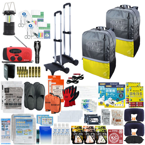 - 防災リュック×2, キャリーカート×2, 多機能防災コンパクト ラジオライト×1, 1200ルーメン フラッシュライト×1, ミニLEDランタン×1, 乾電池式モバイルバッテリー×1, 長期保存 単3電池 4本パック×1, 長期保存 単4電池 4本パック×2, 防寒アルミシート×2, 防寒アルミ寝袋×2, 安眠セット×2, 冷熱快適アルミシート×2, 非常用給水バッグ×1, 10年保存水×4, 5年保存おにぎり×6※製造より5年保存(賞味期限4年半以上保証), 5年保存えいようかん×1, 簡易トイレ10回分×2, 水に流せるペーパー×6, 7年保存 ウェットティッシュ×2, 圧縮 フェイスタオル×2, 個包装マスク×6, お口スッキリシート 2枚入×2, 歯ブラシセット×4, 天然ゴム背抜き手袋×2, レインポンチョ×2, ボールペン×2, ポケットメモ×2, 衣類圧縮袋×2, 携帯用ソールスリッパ×2, カラーホイッスル(安全ストラップ付き)×2, 防災マニュアル×2, 救急セット×2