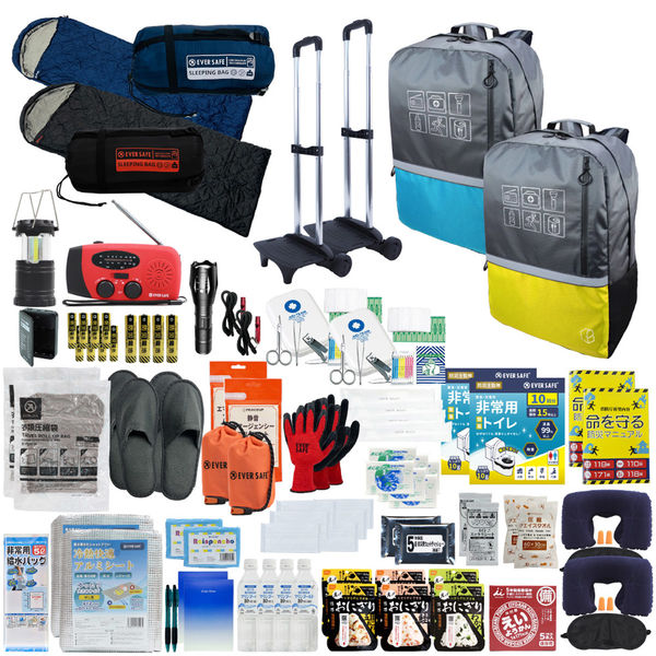 | セット内容品 | 防災リュック×2, 寝袋×2, キャリーカート×2, 多機能防災コンパクト ラジオライト×1, 1200ルーメン フラッシュライト×1, ミニLEDランタン×1, 乾電池式モバイルバッテリー×1, 長期保存 単3電池 4本パック×1, 長期保存 単4電池 4本パック×2, 防寒アルミシート×2, 防寒アルミ寝袋×2, 安眠セット×2, 冷熱快適アルミシート×2, 非常用給水バッグ×1, 10年保存水×4, 5年保存おにぎり×6※製造より5年保存(賞味期限4年半以上保証), 5年保存えいようかん×1, 簡易トイレ10回分×2, 水に流せるペーパー×6, 7年保存 ウェットティッシュ×2, 圧縮 フェイスタオル×2, 個包装マスク×6, お口スッキリシート 2枚入×2, 歯ブラシセット×4, 天然ゴム背抜き手袋×2, レインポンチョ×2, ボールペン×2, ポケットメモ×2, 衣類圧縮袋×2, 携帯用ソールスリッパ×2, カラーホイッスル(安全ストラップ付き)×2, 防災マニュアル×2, 救急セット×2 | ||
