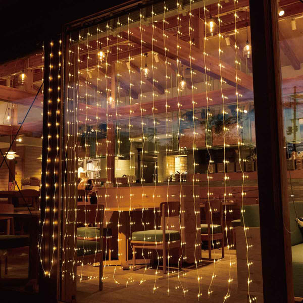 掃き出し窓にピッタリあたたかみあるゴールドの輝きに包まれます。屋外でも使用できるので、店頭を美しく効果的なイルミネーションでライトアップして集客アップ。