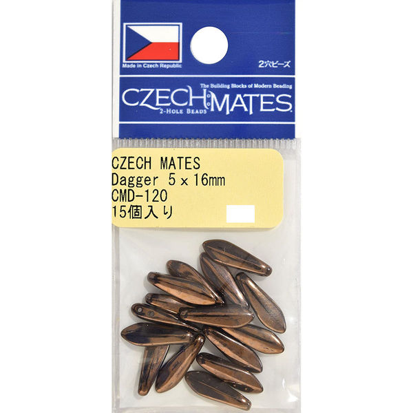 - 「チェコメイト」とは…2穴のビーズで、Tile(タイル)、Dagger(ダガー)、Brick(ブリック)、Lentil(レンティル)、Triangle(トライアングル)の5つの形があります。 5種類のビーズ2つ穴は、すべて同じ幅なので組合わせやすく立体的な作品が制作でき、1つ穴と違った作品が出来上がります。 チェコメイトは、シードビーズとの相性も良く、組合わせて使用することで、繊細さが増します。 またチェコメイトは、ビーズも大きいので扱い易く、丸カン、チェーンを使用することで、簡単なアクセサリーでもご使用頂ける次世代の新しいビーズです。 存在感のフォルムと色展開が、アクセサリー作りに最適です。 ・サイズ:約5×16mm ・色品番:CMD-120 ・容量:15ヶ ・素材:ガラス