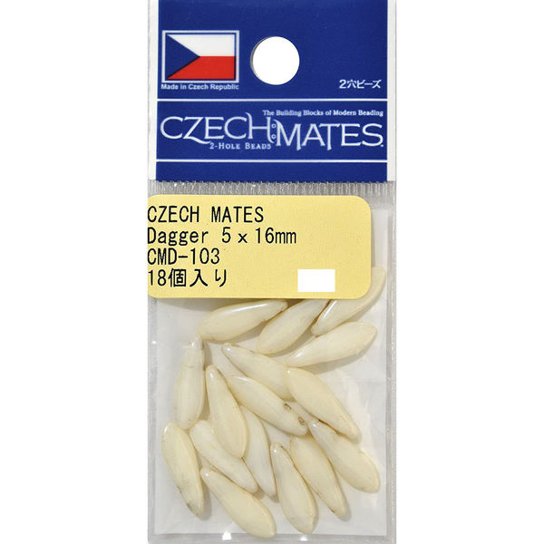 - 「チェコメイト」とは…2穴のビーズで、Tile(タイル)、Dagger(ダガー)、Brick(ブリック)、Lentil(レンティル)、Triangle(トライアングル)の5つの形があります。 5種類のビーズ2つ穴は、すべて同じ幅なので組合わせやすく立体的な作品が制作でき、1つ穴と違った作品が出来上がります。 チェコメイトは、シードビーズとの相性も良く、組合わせて使用することで、繊細さが増します。 またチェコメイトは、ビーズも大きいので扱い易く、丸カン、チェーンを使用することで、簡単なアクセサリーでもご使用頂ける次世代の新しいビーズです。 存在感のフォルムと色展開が、アクセサリー作りに最適です。 ・サイズ:約5×16mm ・色品番:CMD-103 ・容量:18ヶ ・素材:ガラス