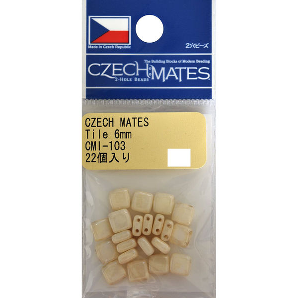 「チェコメイト」とは…2穴のビーズで、Tile(タイル)、Dagger(ダガー)、Brick(ブリック)、Lentil(レンティル)、Triangle(トライアングル)の5つの形があります。 5種類のビーズ2つ穴は、すべて同じ幅なので組合わせやすく立体的な作品が制作でき、1つ穴と違った作品が出来上がります。 チェコメイトは、シードビーズとの相性も良く、組合わせて使用することで、繊細さが増します。 またチェコメイトは、ビーズも大きいので扱い易く、丸カン、チェーンを使用することで、簡単なアクセサリーでもご使用頂ける次世代の新しいビーズです。 存在感のフォルムと色展開が、アクセサリー作りに最適です。 ・サイズ:約6mm ・色品番:CMI-103 ・容量:22ヶ ・素材:ガラス