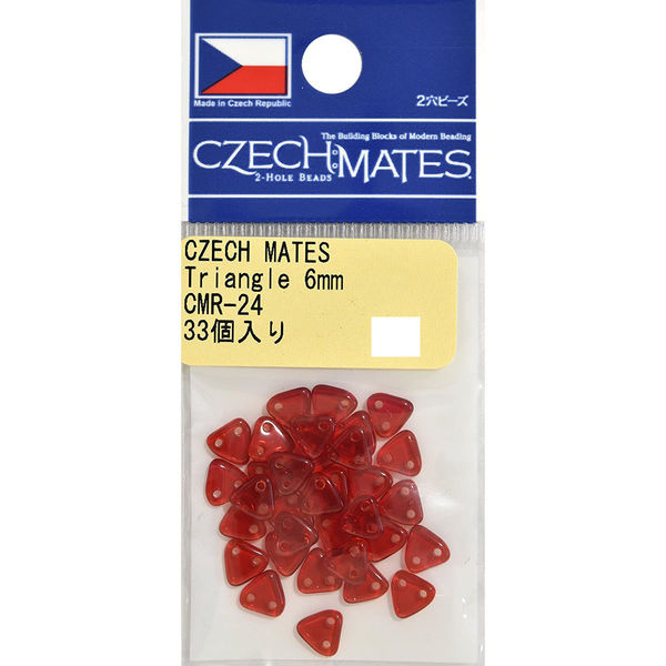 「チェコメイト」とは…2穴のビーズで、Tile(タイル)、Dagger(ダガー)、Brick(ブリック)、Lentil(レンティル)、Triangle(トライアングル)の5つの形があります。 5種類のビーズ2つ穴は、すべて同じ幅なので組合わせやすく立体的な作品が制作でき、1つ穴と違った作品が出来上がります。 チェコメイトは、シードビーズとの相性も良く、組合わせて使用することで、繊細さが増します。 またチェコメイトは、ビーズも大きいので扱い易く、丸カン、チェーンを使用することで、簡単なアクセサリーでもご使用頂ける次世代の新しいビーズです。 存在感のフォルムと色展開が、アクセサリー作りに最適です。 ・サイズ:約6mm ・色品番:CMR-24 ・容量:33ヶ ・素材:ガラス