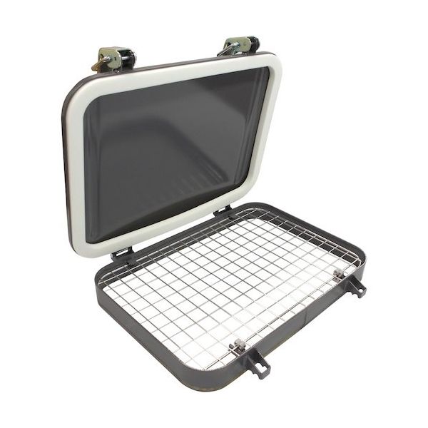 | 原産国 | 日本 | 材質/仕上 | 本体:SS製 枠t3.2、カバーt3.2・レバー:SS製 三価クロムメッキ仕上げ・パッキン:発泡ポリエチレン・網SUS304製:網目 30mm |
