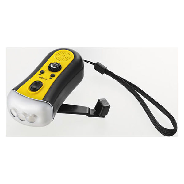 - 本体:ABS樹脂、光源:LED3灯、充電方式:手回し、電源:充電池、機能:ライト・FMラジオ