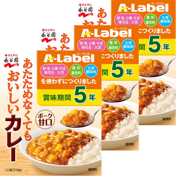 商品の特徴 「卵・乳・小麦・そば・落花生・大豆」と「香料・着色料」、「化学調味料」を使わずにつくった、アレルギー配慮の商品ブランド「A-Label」のカレー(甘口)です。温めずにそのままご飯にかけてもおいしく召し上がれます。製造日から5年の長期保存が可能な商品にリニューアル、備蓄用としてもぴったりです。
