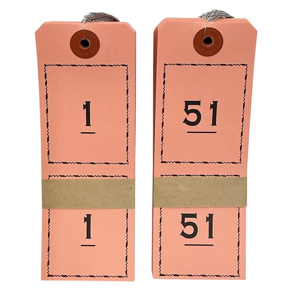 預かり荷物の管理に最適な番号札。ホテルや旅館の手荷物預かりに便利です。柔らかい針金を使用し、1番から100番までセットされた連番荷札です。色別で使い分けください。