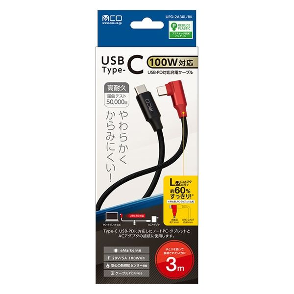 ナカバヤシ Type-C PD100W対応ケーブル L型 3m UPD-2A30L/BK 1本