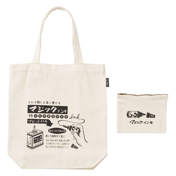 | 本体重量 | 299g | 商品仕様 | レトロ文具を日常に。「古い」からこそ、シンプルで良いところがある。「時が経過している」からこそ、より一層の味わい深さがある。新しいもの、今あるもの。すべての原点は、そこから始まっている。その原点が今、カタチを変えて復刻します。”TERANISHI”(寺西化学工業)は、「マジックインキ」がモチーフです。1953年4月に発売された「マジックインキ」は日本初のマーキングペン。どんなものにでもよく書ける「魔法のインキ」から「マジックインキ」と命名されたそうです。インナーポケット付きトートバッグに、ポーチが付いたセットになっています。 |