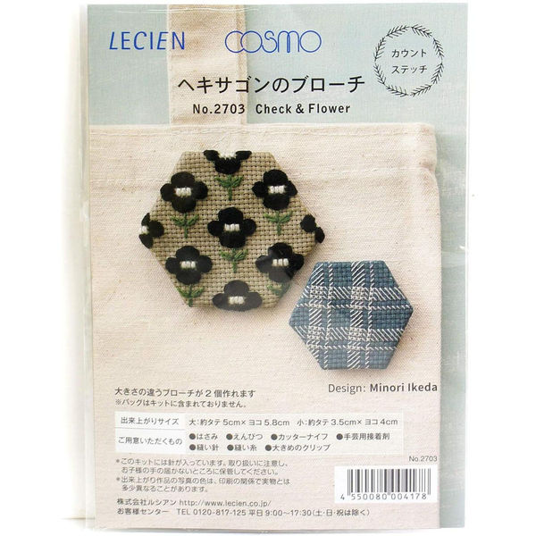 ルシアン カウントステッチ 刺しゅう制作キット ヘキサゴンのブローチ チェック &フラワー 2703 CSK2703 1セット/2個(直送品)
