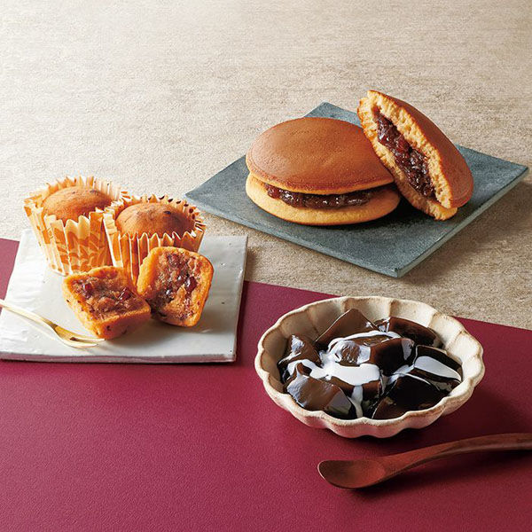 | 質量 | 893g | 内容量 | ふっくらどら焼き×4個、もっちりわらび餅×2個、ほくほく小豆のスイートポテト×2個 |