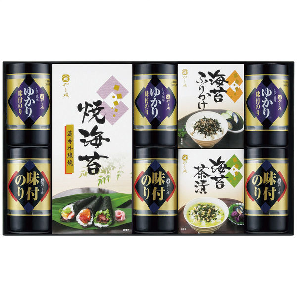 | 商品の特徴 | 口どけの良い海苔に有機丸大豆醤油使用のたれで調味した旨味のある味付海苔、三島食品「ゆかり」をブレンドしたたれで調味した赤しそ風味の味付海苔、遠赤外線でむらなく焼き上げた豊かな香りとパリッとした食感の焼海苔、風味のよい海苔とあられ・抹茶などをブレンドしさっぱりとした後味に仕上げたお茶漬け、やま磯自慢の味付海苔を贅沢に使用した香ばしいごまとの相性が抜群のふりかけの詰合せです。 | ||