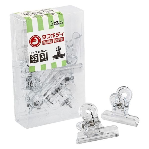 | 商品の特徴 | 割れにくく丈夫なポリカーボネート製の目玉クリップです。スーツケースにも用いられる素材で、踏んでも安心!透明色だから挟んだあとも文字が読みやすいのが特徴です。樹脂素材のため、サビにも強いです。 | ||