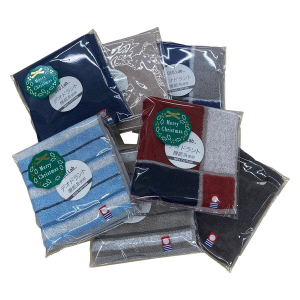 紳士柄の今治マーク付きの消臭機能タオルハンカチが1枚ずつ袋に入っており、クリスマスシールが貼られています。