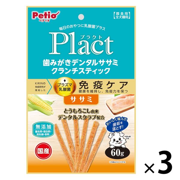 ペティオ プラクト 歯みがきデンタルササミクランチスティック ササミ 無添加 国産 60g 1セット(1袋×3)犬用 おやつ