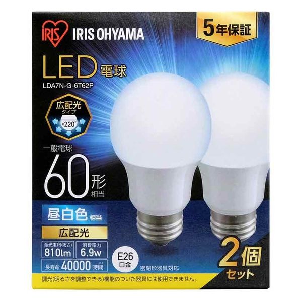 アイリスオーヤマ LED電球 E26 広配光 60形相当 昼白色 2個セット LDA7N-G-6T62P 1箱(2個入)