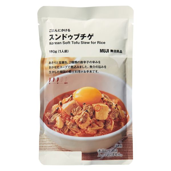 | 商品の特徴 | あさりと豆腐を、2種類の唐辛子の辛みをきかせたスープで煮込みました。魚介の旨みを生かした韓国の郷土料理がお手本です。【無印良品 MUJI】 | ||