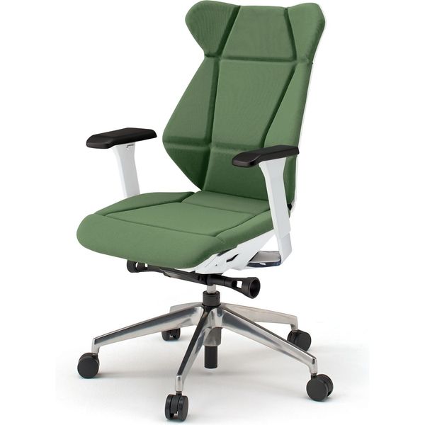 | 材質 | 背・座:再生布地張り(再生ポリエステル50%・ポリエステル50%)、 本体:強化ナイロン樹脂+エラストマー樹脂、 背ブラケット:アルミダイキャスト ミラー仕上、 肘当て:発泡ウレタン一体成型、 肘受け:アルミダイキャスト ミラー仕上、 脚:アルミダイキャスト ミラー仕上・ ナイロン双輪キャスター付き、 | 背・座 | アイビーグリーン |