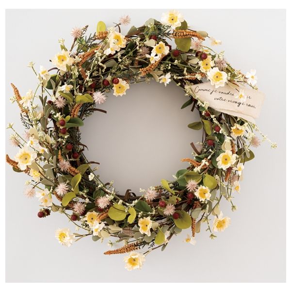 | 寸法 | 約直径370×D100mm | 材質 | 造花(紙、EVA樹脂、発泡スチロール、ポリエステル)、リース土台(自然素材)、ワイヤー布製タグ付 |
