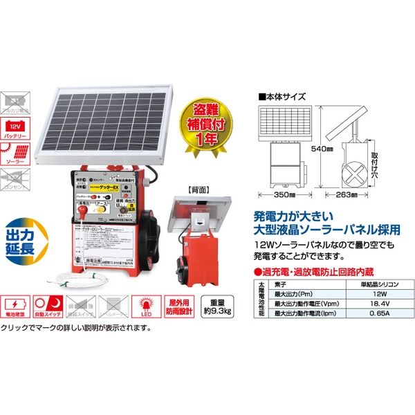 使用電源 バッテリー(12V)、ソーラー(10W) 保証期間 修理保証3年(自然災害対象外)