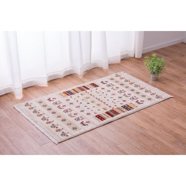| 商品の特徴 | ラグの名産地トルコ製の1枚。民族調手織り絨毯の様なエスニックなデザインをウィルトン織機で織りあげました。毛足は1cm程ありますが、密度が高いので、掃除機もかけやすいようデザインされています。縦糸の特殊加工により折りたたんで収納出来ます。 | ||