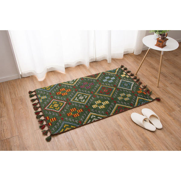 | 商品の特徴 | ウールをカラフルに染め上げ、手織りで1点1点丁寧に織り上げています。ウールは柔らかく弾力性に富み、保温効果も高い素材です。玄関などの最適なサイズです。 | ||