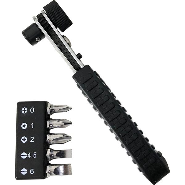 | 商品の特徴 | ドライバービット付きコンパクトサイズのラチェットレンチです。狭い箇所での作業に便利で、プラス0,プラス1,プラス2,マイナス4,マイナス5,マイナス6のドライバービットが付属しています。仮締め用の着脱式早回しリングを外せば、6.35mm角のソケットも使用できます。 | ||