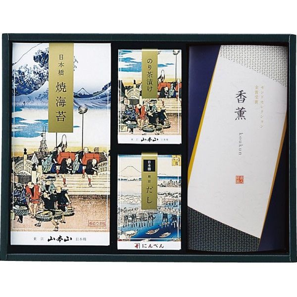 老舗山本山の焼海苔・のり茶漬け、にんべん和風だしに、2019年モンドセレクション金賞、国際優秀品質賞を受賞した香薫(こうくん)の詰合せです。