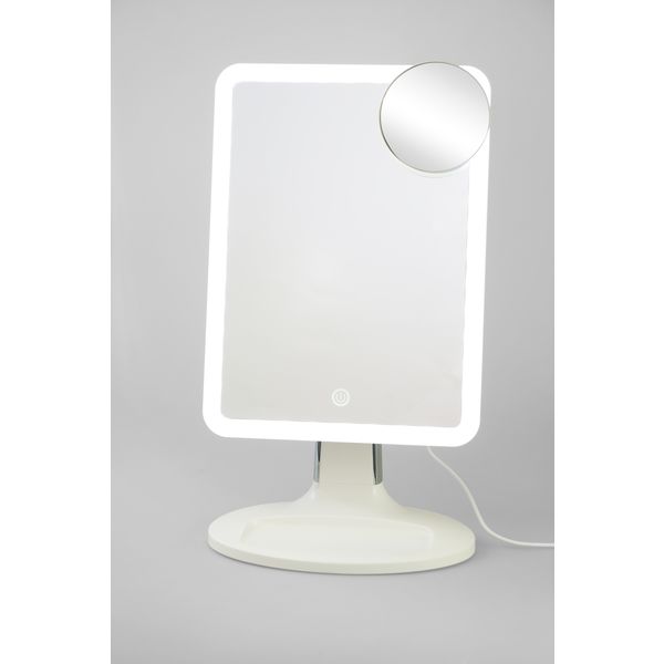 | 商品の特徴 | しっかりメイクしたい方にLEDライト付き大型スタンドミラー10倍拡大鏡付き。鏡のサイズがヨコ22cm、高さ30cmもあるので、上半身全体が映りヘアメイクにも対応するLEDライト付きスタンドミラー。10倍拡大鏡はマグネットでくっついているので手に持って使う事が出来るスグレモノ。LEDライトはタッチセンサー搭載、光りの強さも無段階で調整できます。電源はUSB接続、又は単三乾電池の2ウェイ仕様。 | ||