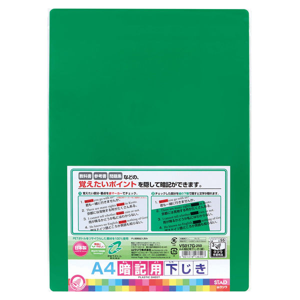 | 商品の特徴 | 環境にやさしい再生PET樹脂100%使用。赤の字や赤マーカー部分を隠せます。A4サイズ。 | ||