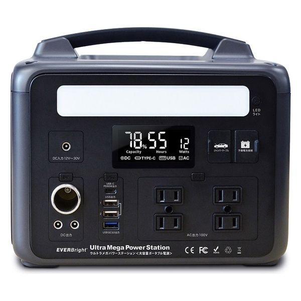| 商品の特徴 | 電池種類 電池電圧/容量:リン酸鉄リチウムイオン電池 3.2V/200,000mAh(640Wh) UBS出力:USB(5V/2.4A) x 2、USBQC3.0(5V/3A,9V/2A,12V/1.5A) 、USB-C PD60W(5V/3A,9V/3A,12V/3A,15V/3A,20V/3A) AC出力:4個、純正弦波 100V/60Hz 定格出力 600W(最大1200W) | ||