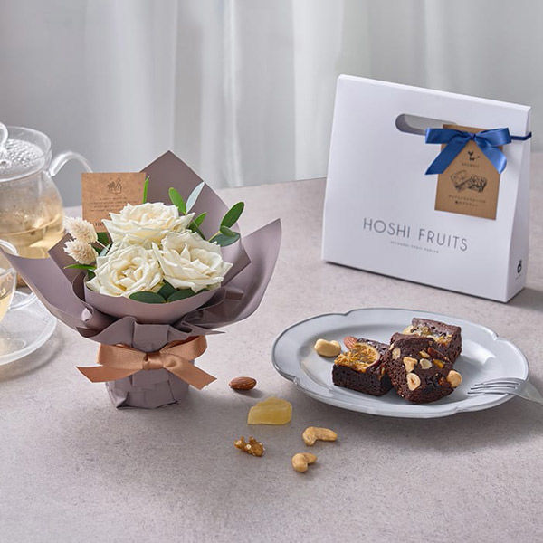 | 商品の特徴 | 濃厚なチョコレートの生地に、香ばしいナッツや甘酸っぱいフルーツをトッピングした贅沢ブラウニー3個と、清楚で輝きを放つような白バラ・アバランチェを使ったミニアレンジメントをセットにしてお届けします。 | ||