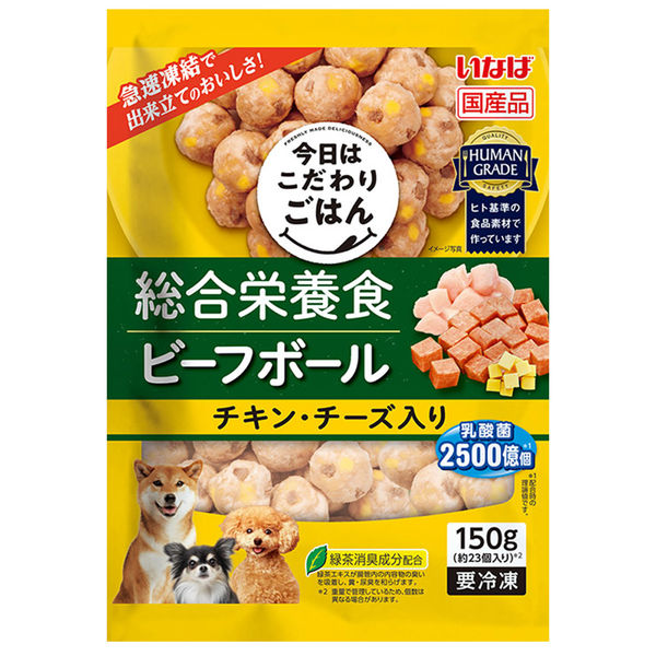 | 商品の特徴 | 厳選された素材を使用した、こだわりのミートボール。1日に必要な栄養素をバランスよく配合した総合栄養食のドッグフードです。急速冷凍により、いつでも出来立ての美味しさでお与えできます。1袋あたりに乳酸菌2,500億個配合で、愛犬のお腹の健康維持に配慮しました。緑茶エキスが腸管内の内容物の臭いを吸着し、糞・尿臭を和らげます。出来立てをすぐに冷凍することで、おいしさを閉じ込めました。 | ||