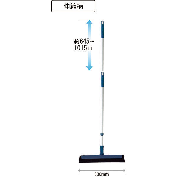山崎産業のプロテックブルロン。掃き掃除から水切りまでマルチにこなすラバータイプの伸縮ほうき。ラバー部分にソフトな発泡ゴム材を使用。毛や綿埃、紙などの多い場所に便利。