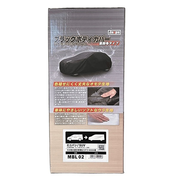 | 商品の特徴 | 目立たない落ち着いたブラックカラーのボディカバーです。裏生地は車体に傷がつきにくい不織布を使用しています。車へのいたずら防止や、車種が分からない為に盗難予防にも役立ちます。駐車時の汚れの原因(鳥のフン、樹液、黄砂)や紫外線から守ります。フロント部に光に反射するリフレクションテープを採用しています。風対策ベルト付属でボディカバーをしっかりと装着します。 | ||