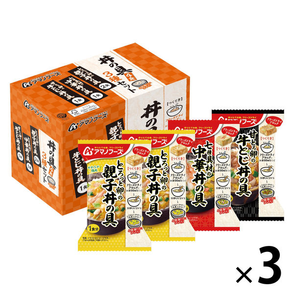 | 商品の特徴 | ●お湯を注ぐだけで出来る、小腹満たしにぴったりな丼の具のセット●「とろっと卵の親子丼の具」、「七種具材の中華丼の具」、「甘とろ卵の牛とじ丼の具」の3種アソート●とろっとした卵や食感の良い野菜、やわらかいお肉などの具材入り●家庭と同じようにだしや醤油などで味付けした手作りの味わい●1食あたり100kcal前後 | ||