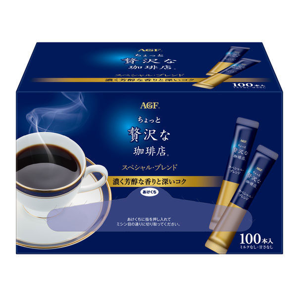 | 商品の特徴 | ブラジル産最上級グレード豆の特徴を活かし、深いコクと澄んだ後味を実現しました。全てに贅を尽くした本格的な味わいをお楽しみいただけます。1杯1杯がいつも新鮮な個包装スティックコーヒーです。ブラックコーヒーではもちろんお好みでスティックシュガーやスティックコーヒーミルクと一緒にオフィスやご家庭でお楽しみください。コーヒー豆の焙煎から充填まで国内の工場で生産しています。100杯分なので、オフィスやご自宅でたくさん消費される方に最適なインスタントコーヒーです。 | ||