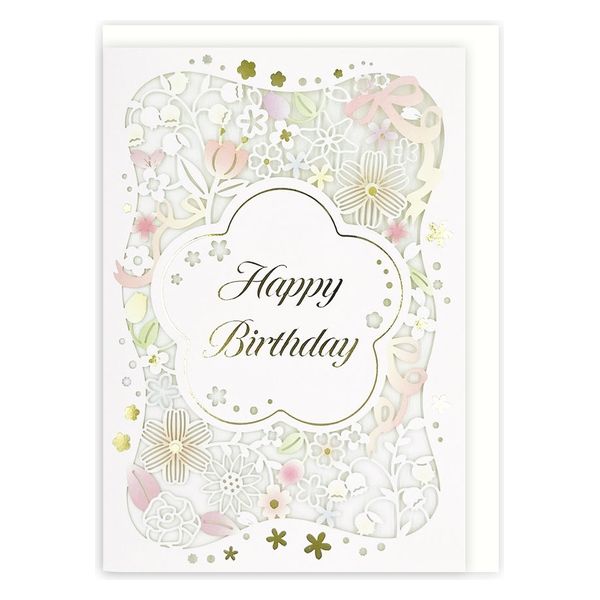 | 商品の特徴 | 繊細なレーザーカット加工が美しい誕生日カードはどの年代の方にも喜ばれるようなシンプルなデザイン。金箔加工も御祝にピッタリ! | ||