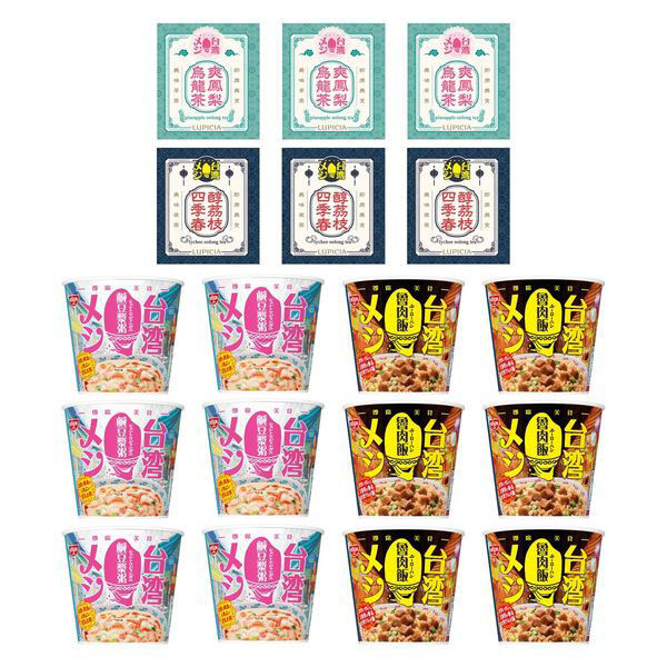 | 商品の特徴 | 日清食品&LUPICIA(ルピシア)共同企画のオリジナル台湾烏龍茶(2種各3個)がついてくる!日清台湾メシ 鹹豆漿粥(シェントウジャンがゆ)、日清台湾メシ 魯肉飯(ルーローハン) 各6食(計12食)セット。茶葉は、パイナップルと芳しいジャスミンが香る爽やかで口当たりのやさしい「爽鳳梨烏龍茶」、ライチと華やかなローズが香るしっかりとした味わいの「醇茘枝四季春」の2種類。ぜひ日清台湾メシ 鹹豆漿粥、日清台湾メシ 魯肉飯とご一緒にお楽しみください! | ||
