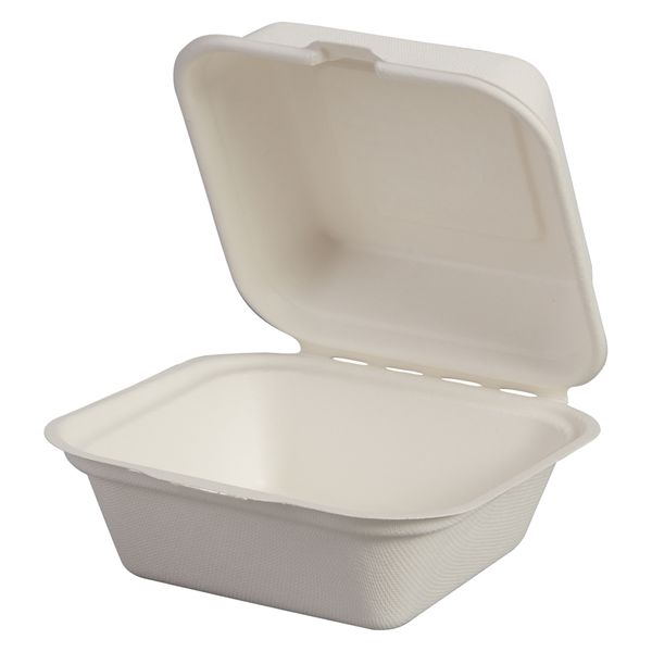 100%天然素材の環境に配慮したさとうきび(バガス)素材のモールド容器。ハンバーガー・ドーナツなどにぴったりなスクエアボックス型。
