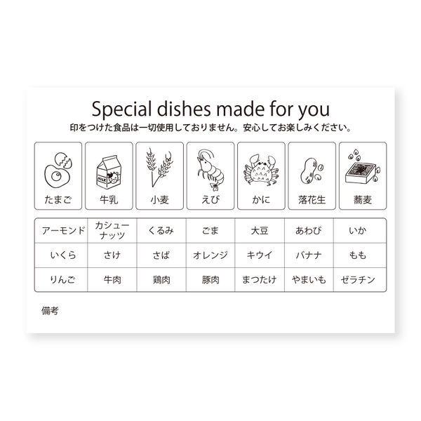 | 商品の特徴 | 【Goエシカル】訳あり アレルギー表示義務・推奨されている特定原材料28品目の不使用を明記する書き込み式ラベルです。再剥離タイプなので、座席やテーブルなどにも貼り剥がし可能です。テイクアウトや宿泊施設等の配膳、個別対応にご活用ください。●20枚入(4枚×5シート) | ||