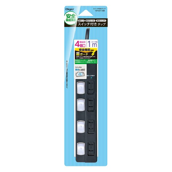 | 商品の特徴 | ■雷サージを吸収する雷ガード機能。雷による被害を軽減します(最大6000V)。■シャッターは差し込み口がスライドする独自機構。ホコリやイタズラを防止します。■それぞれの差し込み口にon/offスイッチ。青色LEDランプ付。■狭い場所でも設置しやすい180度回転するスイングブラグ採用。■安全性、信頼性の高い二重被覆コード。■プラグの根元部分にトラッキング火災防止に効果的な絶縁キャップ。 | ||