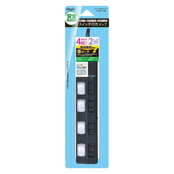 | 商品の特徴 | ■雷サージを吸収する雷ガード機能。雷による被害を軽減します(最大6000V)。■シャッターは差し込み口がスライドする独自機構。ホコリやイタズラを防止します。■それぞれの差し込み口にon/offスイッチ。青色LEDランプ付。■狭い場所でも設置しやすい180度回転するスイングブラグ採用。■安全性、信頼性の高い二重被覆コード。■プラグの根元部分にトラッキング火災防止に効果的な絶縁キャップ。 | ||